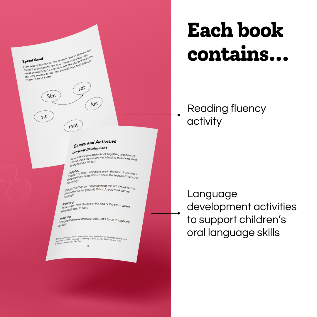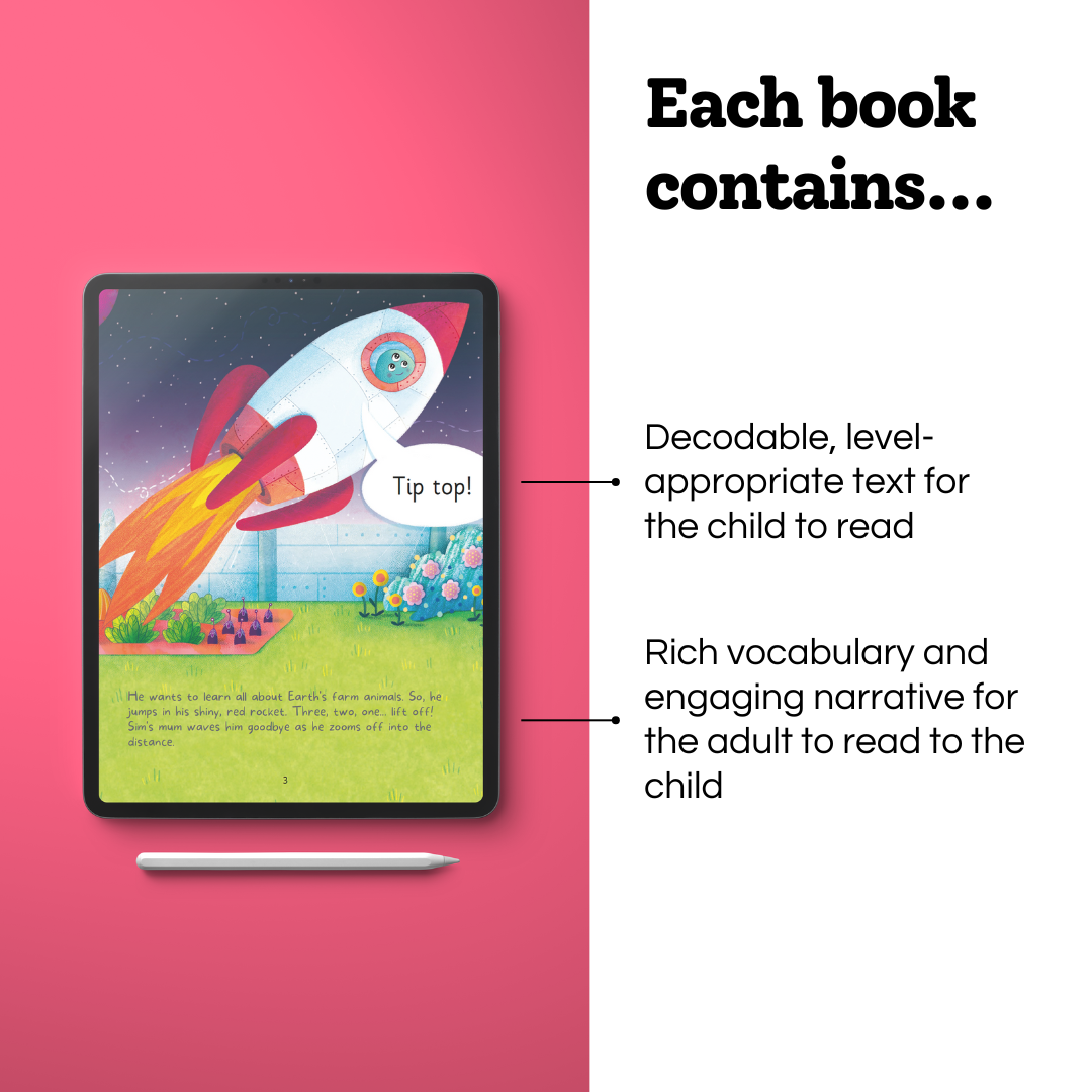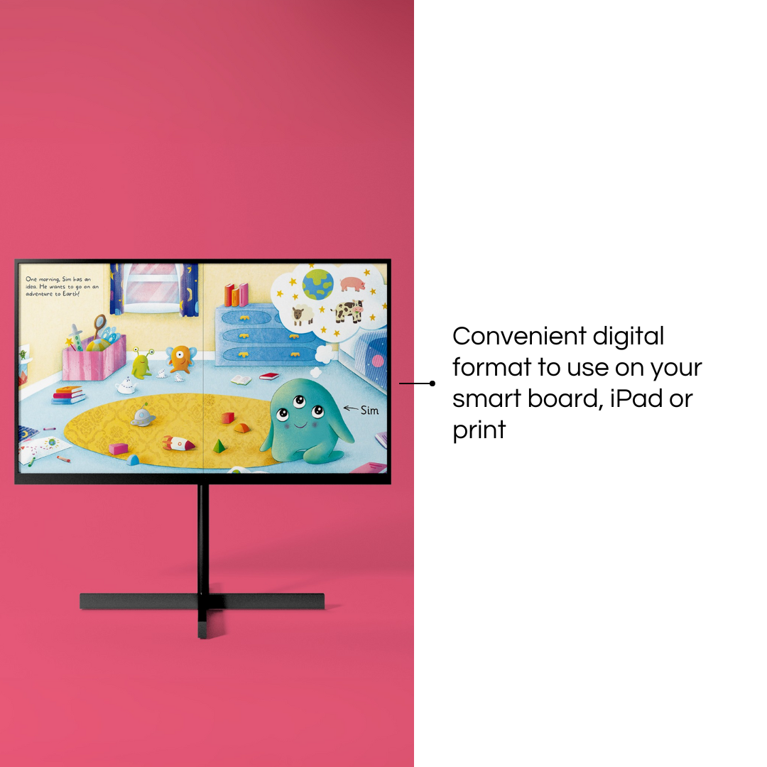 The Reading Together Collection is an engaging and beautifully illustrated series of decodable readers about an alien called Sim and his adventures on Earth and his home planet. Each book contains text for an adult to read and text for a student to read, meaning that children are exposed to rich vocabulary and narrative whilst practising the skills and sounds taught in Initial Code Units 1-3. The books contain 8 pages of illustrations and text and two pages of games and activities that will promote students’ oral language development and reading fluency. This convenience e-books format means Early Years Practitioners can use these texts on interactive whiteboards, iPads and print.